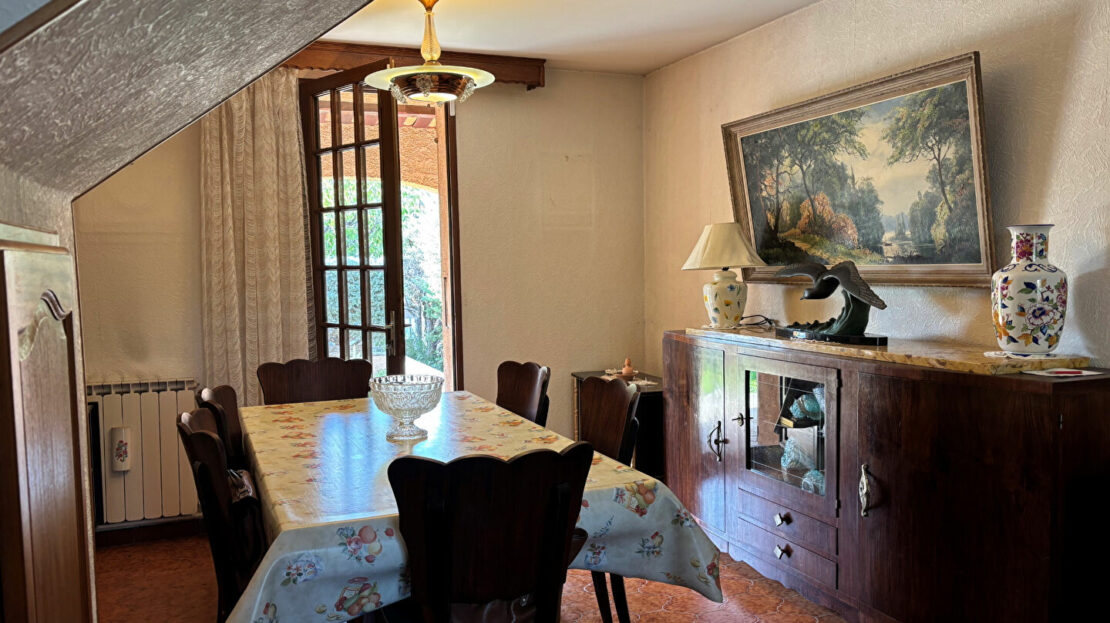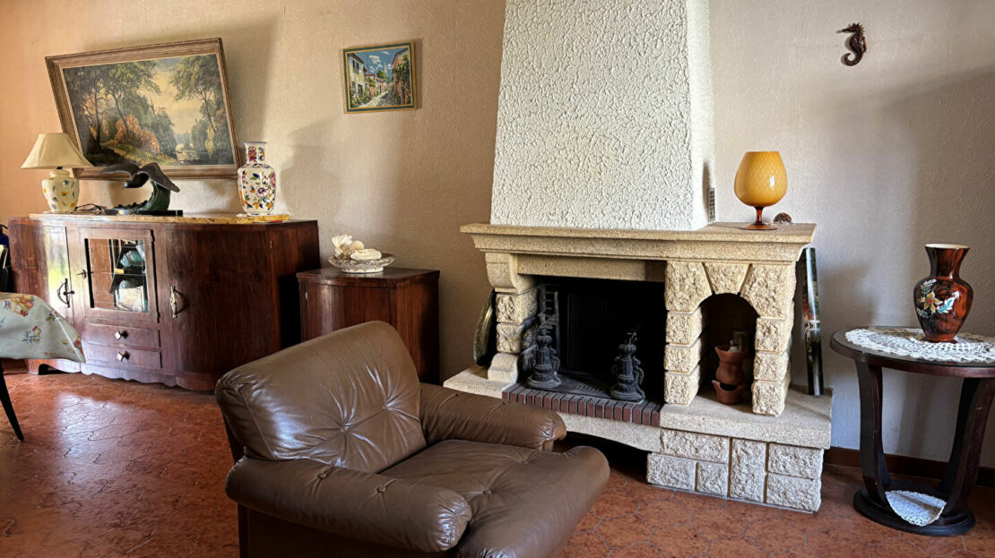Séjour avec cheminée, cuisine équipée avec son cellier, trois chambres, salle de bains, 2 wc. Cabanon de jardin. Climatisation. Travaux de remise aux goûts du jour à prévoir.