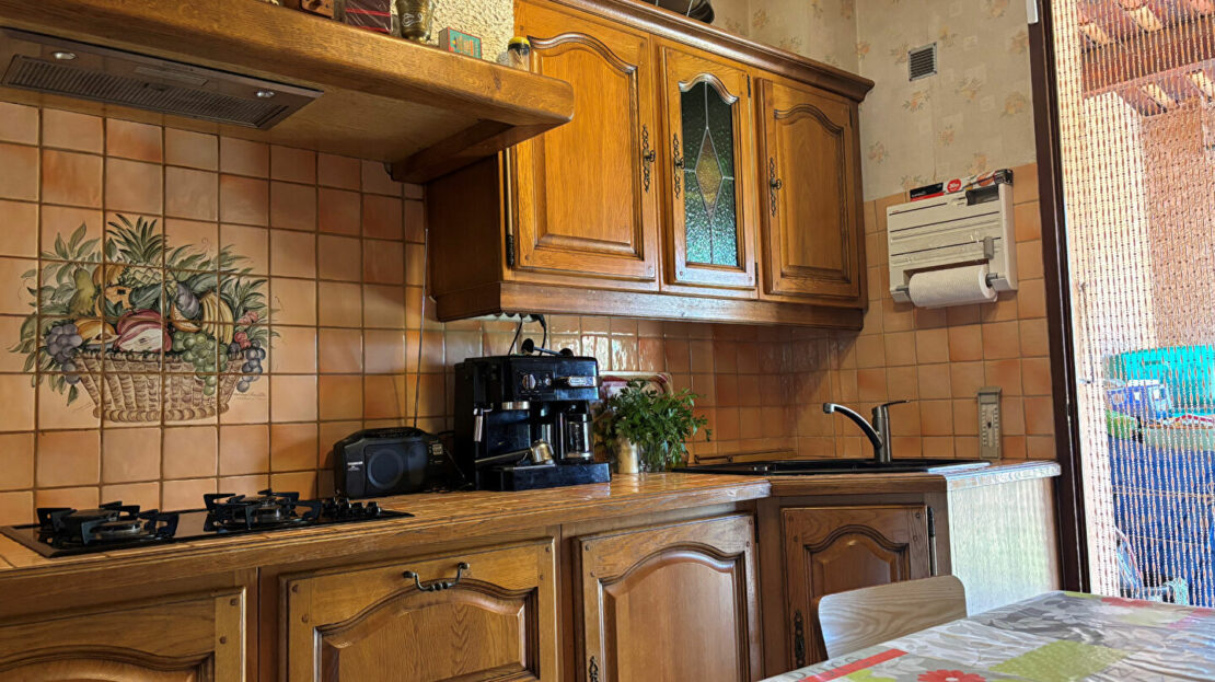 Salon / séjour avec cheminée, cuisine indépendante équipée avec son cellier, trois chambres, salle de bains, 2 wc. Cabanon de jardin. Climatisation dans les chambres. Travaux de remise aux goûts du jour à prévoir.