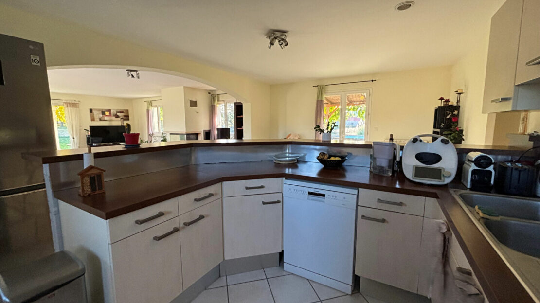 Villa T6 de 175m² habitables comprenant un coin de vie de 85m² avec cuisine américaine aménagée donnant sur salon / séjour avec cheminée, quatre chambres, un bureau, deux salles d’eau et wc. Le tout sur 10 000m² de terrain clos avec double garage d’environ 30m².